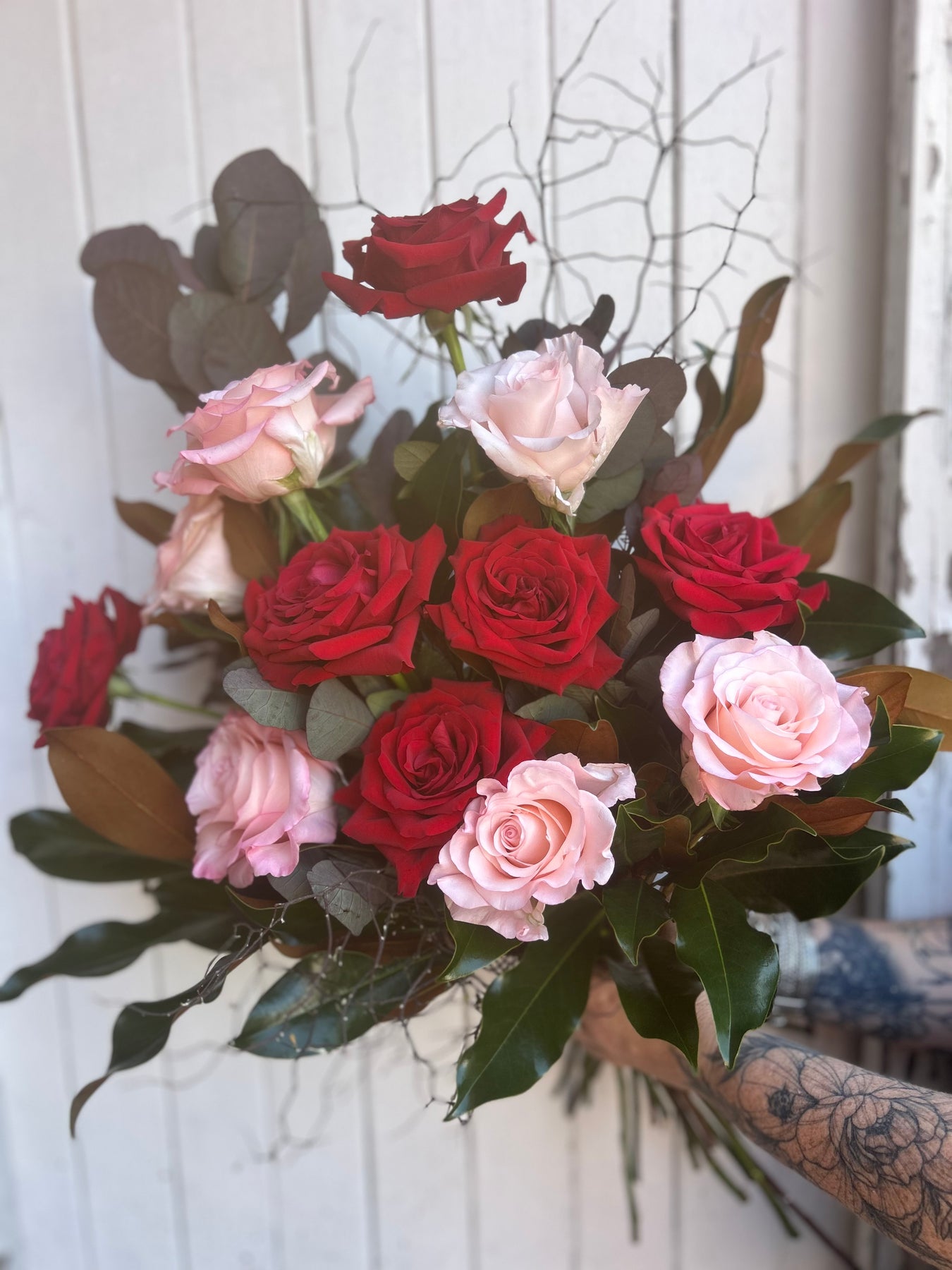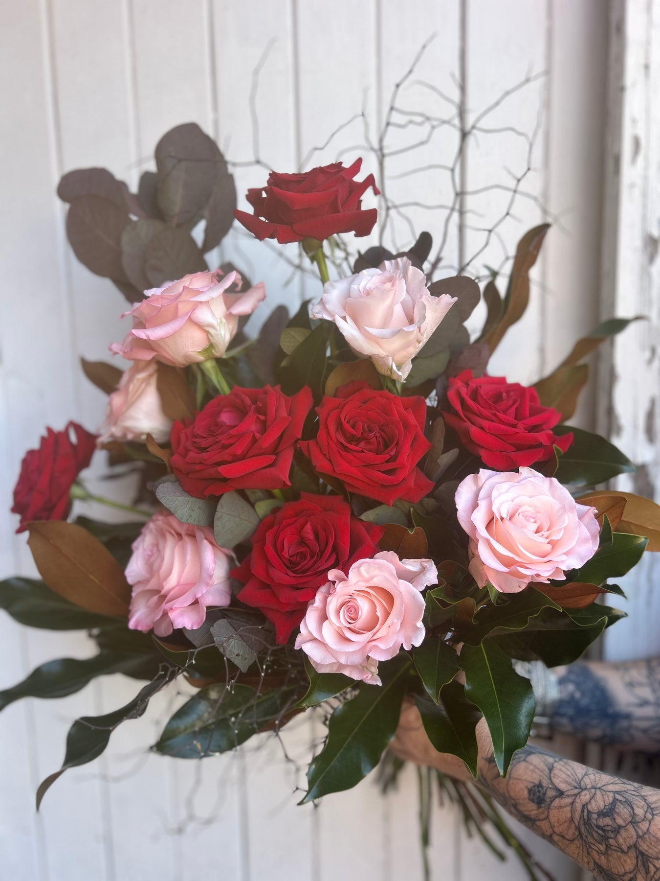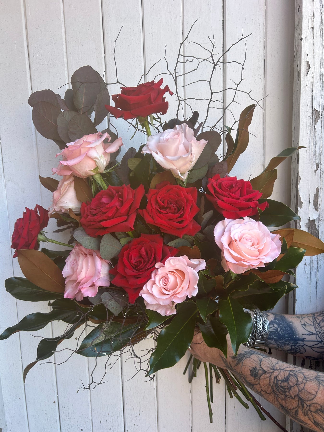 12 mixed red and pink Columbian roses with beautiful foliage